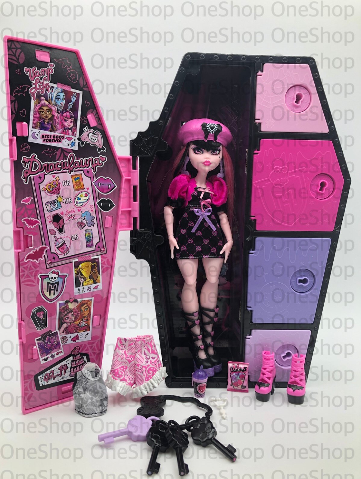 The Draculaura doll has straight hair and is manufactured by Mattel. It is an original piece and was manufactured in 2022. The doll is perfect for any Monster High collector or enthusiast!