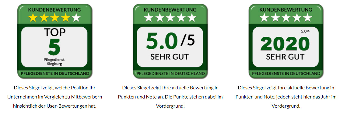Sie können im unteren Abschnitt eins der zur Verfügung stehenden Qualitätssiegel auswählen und sich so Ihren eigenen Code generieren. Das Siegel können Sie dann auf Ihrer Website wo Sie möchten einfügen. Je nachdem, wie sich Ihre Bewertungen auf der „Pflegedienste in Deutschland“ Webseite verändern, verändert sich auch ganz automatisch das Siegel auf Ihrer eigenen Webseite.