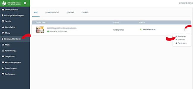 Sobald sich Ihr Dashboard geöffnet hat, können Sie rechts auf der Seite alle vorhandenen Features Ihres Kontos sehen. Klicken Sie nun auf den Navigationspunkt „Einträge/Standorte“. Es werden Ihnen alle einzelnen Einträge angezeigt.